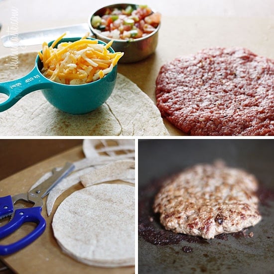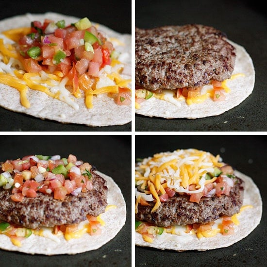 100% grass-fed buffalo burgers with melted cheddar jack cheese and pico de gallo wedged in between two whole wheat tortillas.