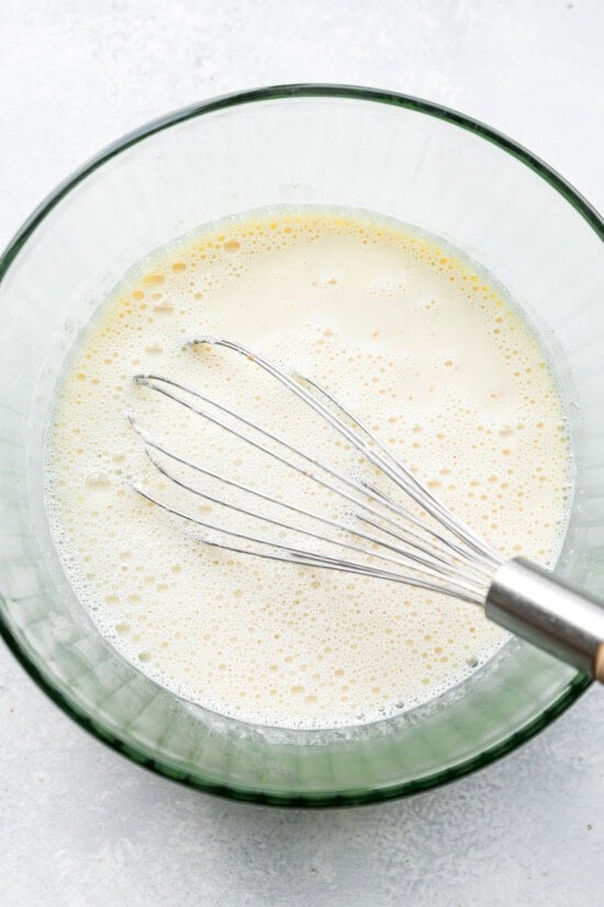 - In a large bowl whisk egg yolks. Slowly add about 1 cup of the hot milk mixture through a mesh sieve to the yolks, whisking in about a tablespoon at a time to temper the egg so the egg doesn’t cook.