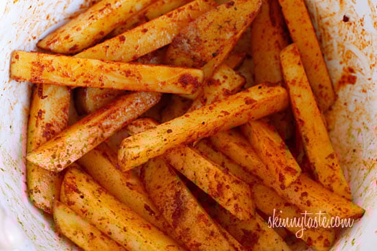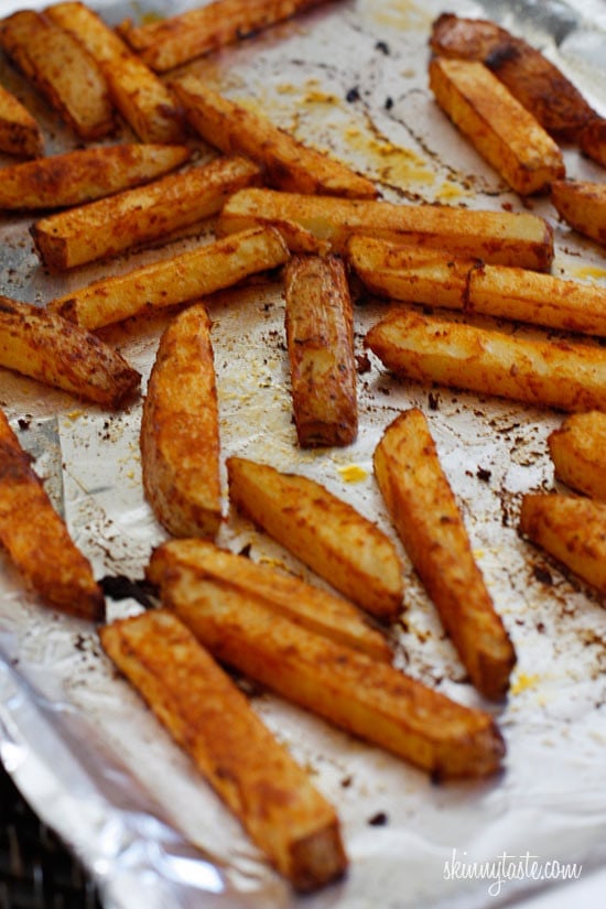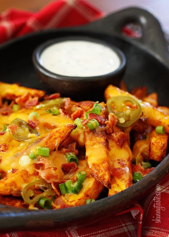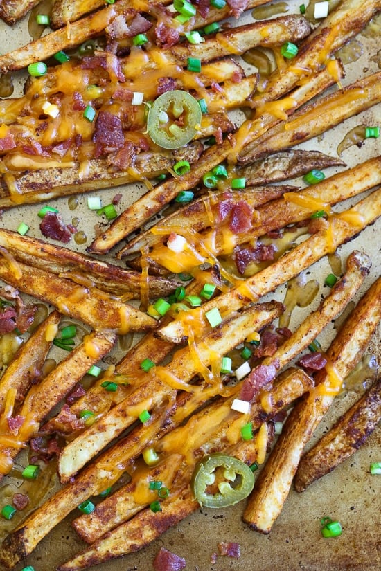 Guiltless cheesy baked seasoned fries topped with bacon, jalapeños and scallions... this is SOOO good! Pure comfort food when cheese fries are what you're craving.