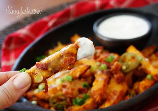 Guiltless cheesy baked seasoned fries topped with bacon, jalapeños and scallions… this is SOOO good! Pure comfort food when cheese fries are what you’re craving.