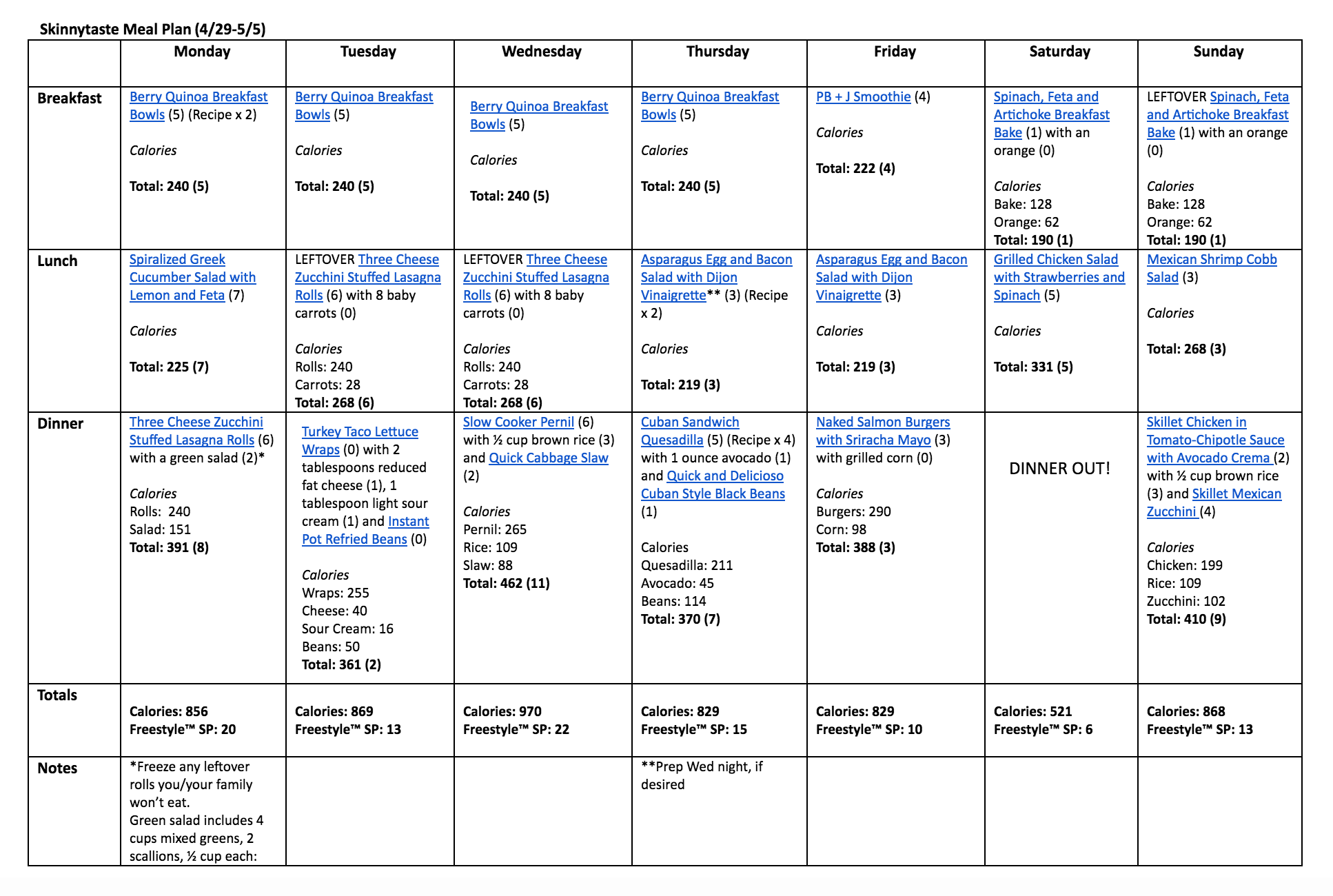 Breakfast and lunch Monday-Friday, are designed to serve 1 while dinners and all meals on Saturday and Sunday are designed to serve a family of 4. Some recipes make enough leftovers for two nights or lunch the next day. While we truly believe there is no one size fits all meal plan, we did our best to come up with something that appeals to a wide range of individuals. Everything is Weight Watchers friendly, I included the updated Weight Watcher Freestyle Points for your convenience, feel free to swap out any recipes you wish or just use this for inspiration!