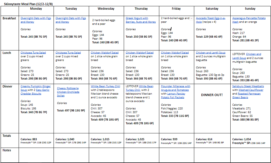 Breakfast and lunch Monday-Friday, are designed to serve 1 while dinners and all meals on Saturday and Sunday are designed to serve a family of 4. Some recipes make enough leftovers for two nights or lunch the next day. While we truly believe there is no one size fits all meal plan, we did our best to come up with something that appeals to a wide range of individuals. Everything is Weight Watchers friendly, I included the updated WW Blue SP for your convenience, feel free to swap out any recipes you wish or just use this for inspiration!