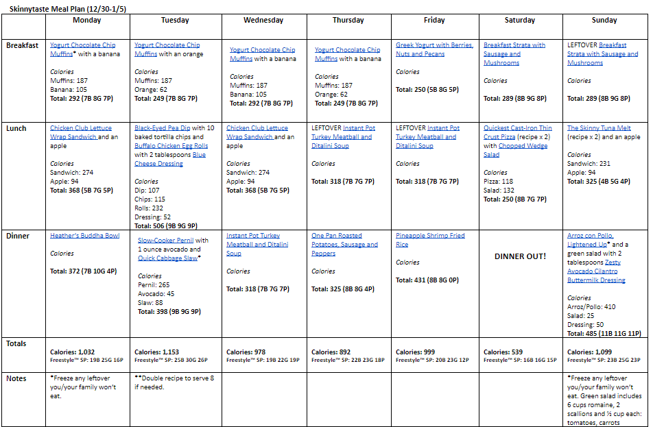 Breakfast and lunch Monday-Friday, are designed to serve 1 while dinners and all meals on Saturday and Sunday are designed to serve a family of 4. Some recipes make enough leftovers for two nights or lunch the next day. While we truly believe there is no one size fits all meal plan, we did our best to come up with something that appeals to a wide range of individuals. Everything is Weight Watchers friendly, I included the updated WW Blue SP for your convenience, feel free to swap out any recipes you wish or just use this for inspiration!