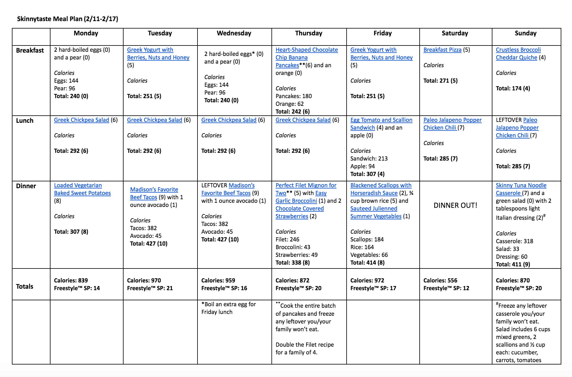 Breakfast and lunch Monday-Friday, are designed to serve 1 while dinners and all meals on Saturday and Sunday are designed to serve a family of 4. Some recipes make enough leftovers for two nights or lunch the next day. While we truly believe there is no one size fits all meal plan, we did our best to come up with something that appeals to a wide range of individuals. Everything is Weight Watchers friendly, I included the updated Weight Watcher Freestyle Points for your convenience, feel free to swap out any recipes you wish or just use this for inspiration!