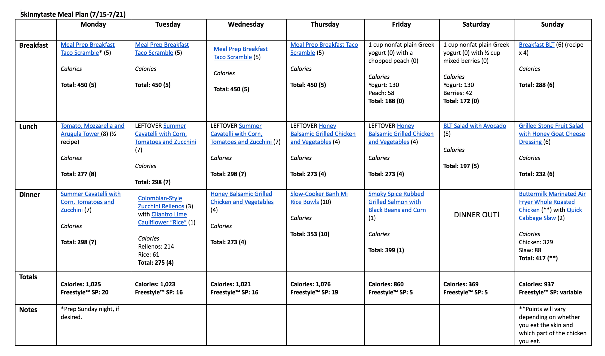 Breakfast and lunch Monday-Friday, are designed to serve 1 while dinners and all meals on Saturday and Sunday are designed to serve a family of 4. Some recipes make enough leftovers for two nights or lunch the next day. While we truly believe there is no one size fits all meal plan, we did our best to come up with something that appeals to a wide range of individuals. Everything is Weight Watchers friendly, I included the updated Weight Watcher Freestyle Points for your convenience, feel free to swap out any recipes you wish or just use this for inspiration!