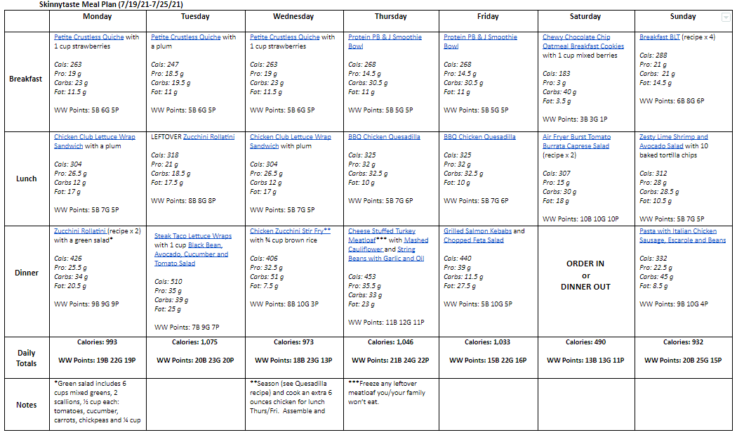 Breakfast and lunch Monday-Friday, are designed to serve 1 while dinners and all meals on Saturday and Sunday are designed to serve a family of 4. Some recipes make enough leftovers for two nights or lunch the next day. While we truly believe there is no one size fits all meal plan, we did our best to come up with something that appeals to a wide range of individuals. Everything is Weight Watchers friendly, I included the updated WW Blue SP for your convenience, feel free to swap out any recipes you wish or just use this for inspiration!