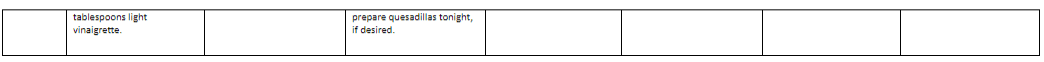 # Season (see Quesadilla recipe) and cook an extra 6 ounces chicken for lunch Thurs/Fri. Assemble and prepare quesadillas tonight, if desired.