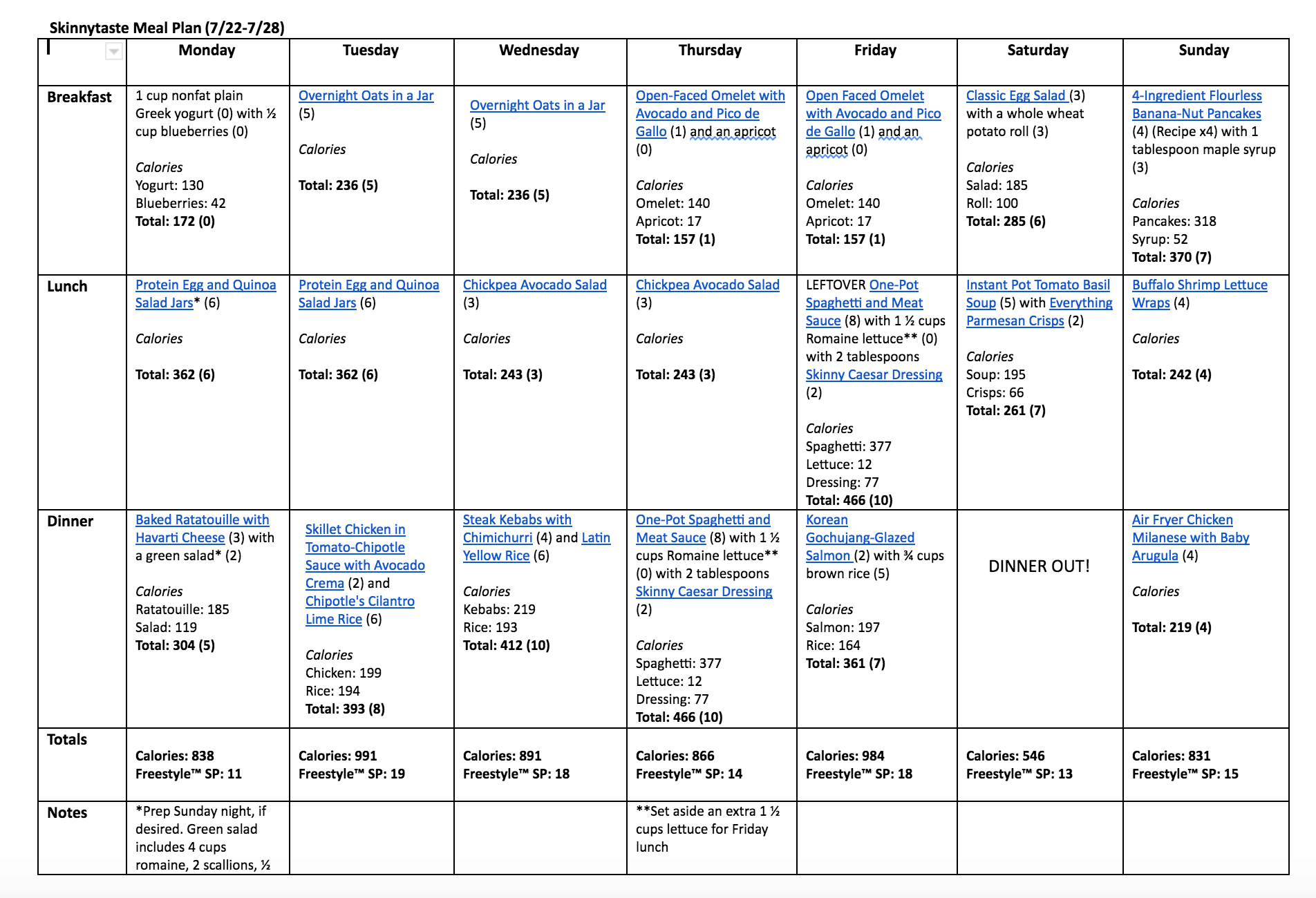 A free 7-day flexible weight loss meal plan including breakfast, lunch and dinner and a shopping list. All recipes include calories and Weight Watchers SmartPoints®.