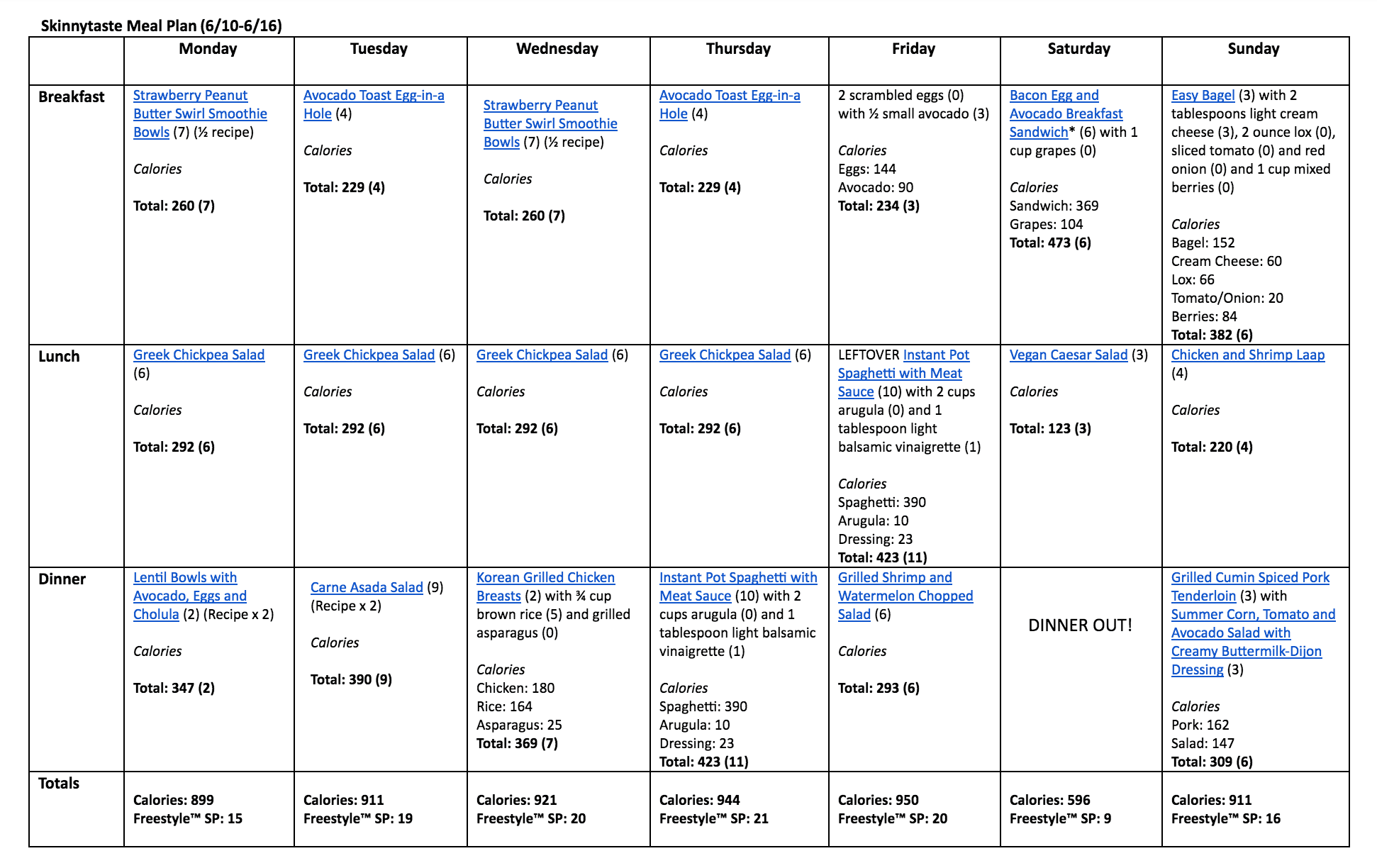 Breakfast and lunch Monday-Friday, are designed to serve 1 while dinners and all meals on Saturday and Sunday are designed to serve a family of 4. Some recipes make enough leftovers for two nights or lunch the next day. While we truly believe there is no one size fits all meal plan, we did our best to come up with something that appeals to a wide range of individuals. Everything is Weight Watchers friendly, I included the updated Weight Watcher Freestyle Points for your convenience, feel free to swap out any recipes you wish or just use this for inspiration!