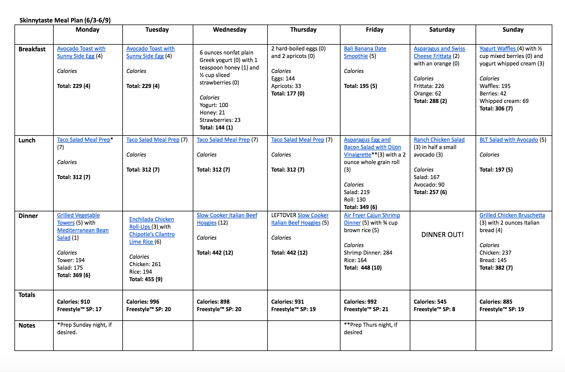 Breakfast and lunch Monday-Friday, are designed to serve 1 while dinners and all meals on Saturday and Sunday are designed to serve a family of 4. Some recipes make enough leftovers for two nights or lunch the next day. While we truly believe there is no one size fits all meal plan, we did our best to come up with something that appeals to a wide range of individuals. Everything is Weight Watchers friendly, I included the updated Weight Watcher Freestyle Points for your convenience, feel free to swap out any recipes you wish or just use this for inspiration!