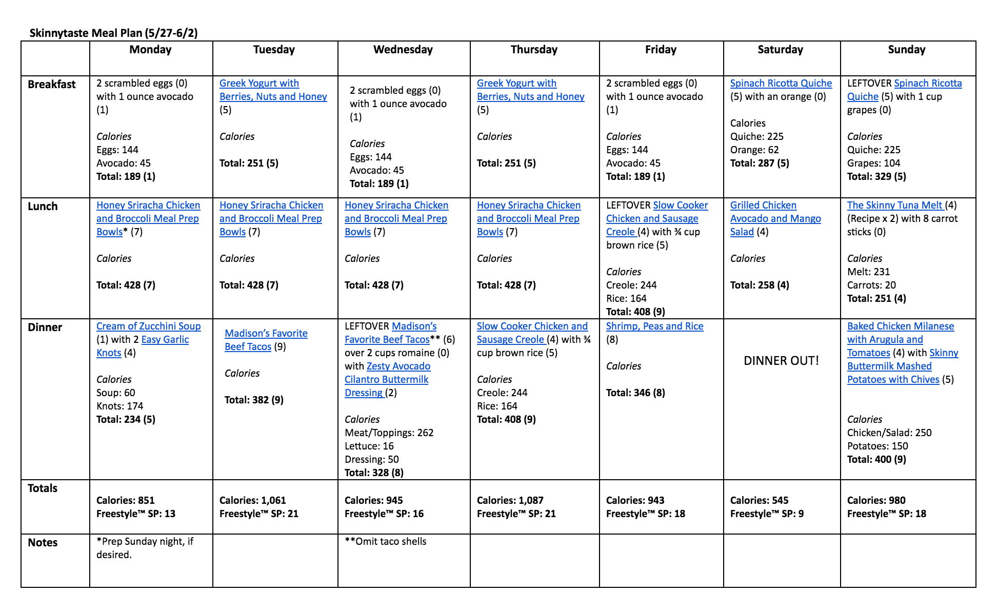 Breakfast and lunch Monday-Friday, are designed to serve 1 while dinners and all meals on Saturday and Sunday are designed to serve a family of 4. Some recipes make enough leftovers for two nights or lunch the next day. While we truly believe there is no one size fits all meal plan, we did our best to come up with something that appeals to a wide range of individuals. Everything is Weight Watchers friendly, I included the updated Weight Watcher Freestyle Points for your convenience, feel free to swap out any recipes you wish or just use this for inspiration!