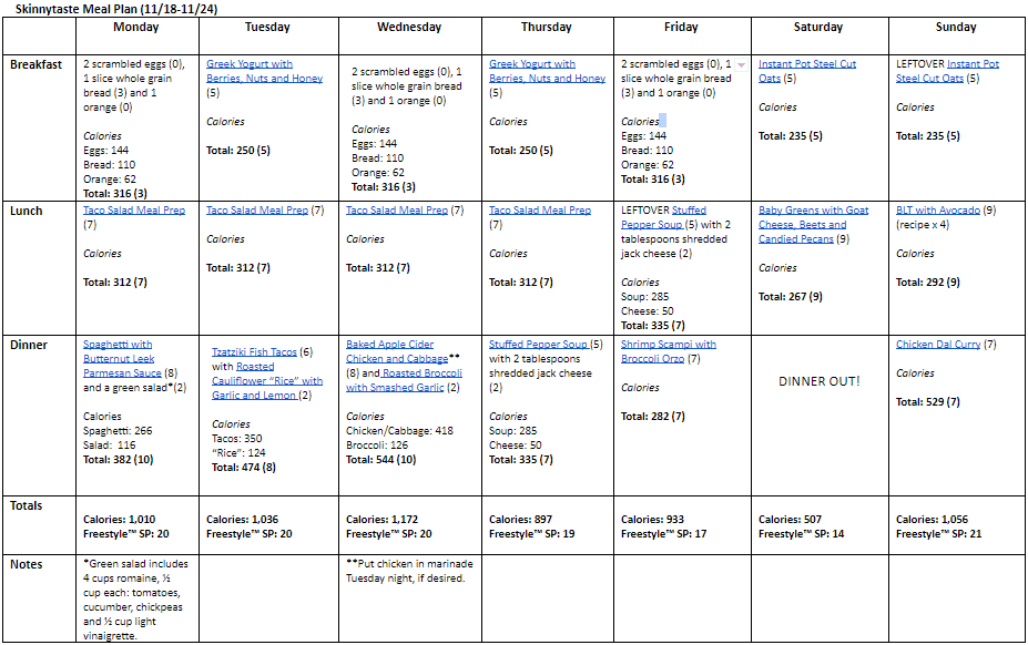 Breakfast and lunch Monday-Friday, are designed to serve 1 while dinners and all meals on Saturday and Sunday are designed to serve a family of 4. Some recipes make enough leftovers for two nights or lunch the next day. While we truly believe there is no one size fits all meal plan, we did our best to come up with something that appeals to a wide range of individuals. Everything is Weight Watchers friendly, I included the updated WW Blue SP for your convenience, feel free to swap out any recipes you wish or just use this for inspiration!