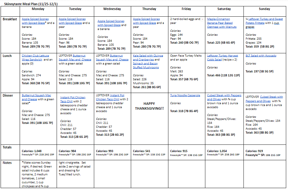 I know that this upcoming week is a crazy one for many of us, so I tried to keep the beginning of the week pretty simple and then incorporated some of my Thankgsiving recipes so that we can all use up those leftovers! I have a long list of things to be thankful for, and all of you are on that list. I wish all of you a happy holiday!