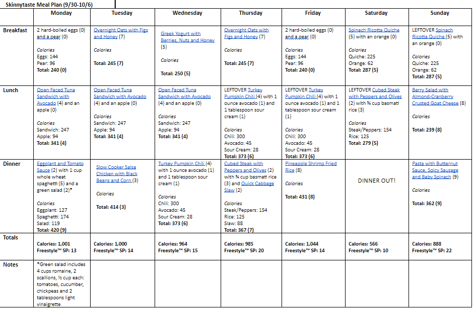 A free 7-day flexible weight loss meal plan including breakfast, lunch and dinner and a shopping list. All recipes include calories and Weight Watchers SmartPoints®.