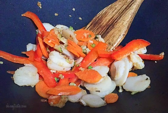 - Reduce the heat to medium-high, add the oil, scallion whites, garlic, ginger, carrots, water chestnuts, and red pepper to the wok and toss frequently until beginning to soften, about 2 minutes.