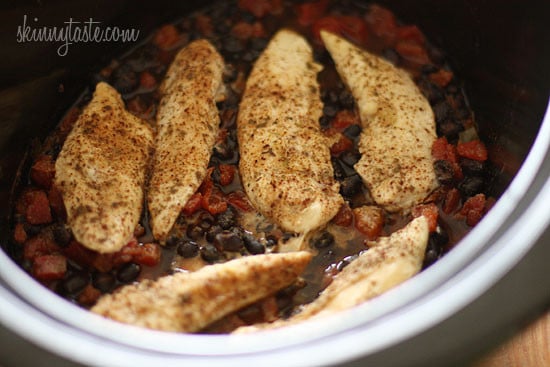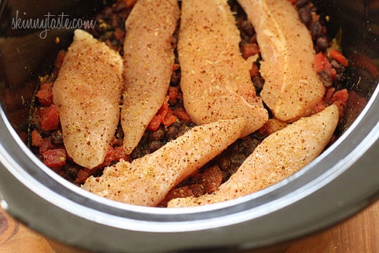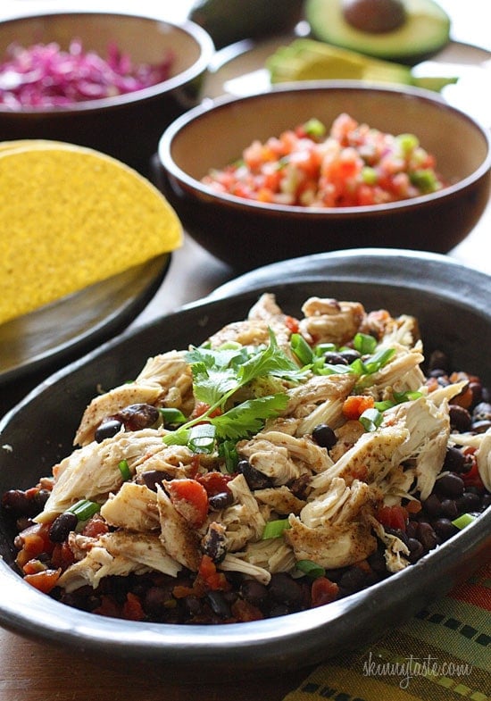 This easy taco recipe requires no pre-cooking, just throw it all in the crock pot and you’ll have a delicious weeknight meal. Black beans and chicken breast, simmered in the slow cooker make the perfect filling for tacos, burritos, enchiladas, or even a burrito bowl and it’s loaded with fiber.