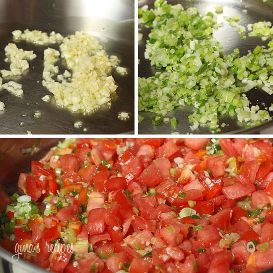 - Add scallions and garlic, sauté 2 minutes, add tomatoes and peppers.