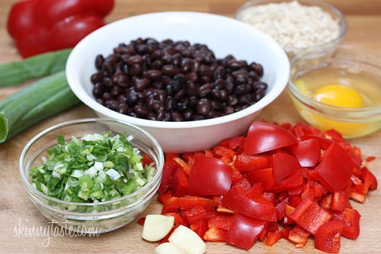 - In a food processor, finely chop bell pepper, cilantro, onion, and garlic, then add oats, then eggs and spices.