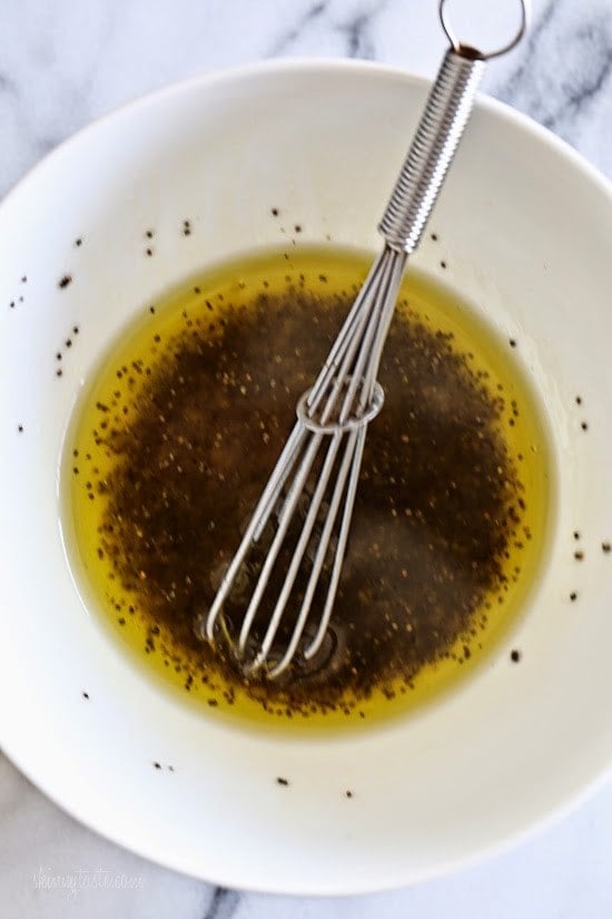 - For the dressing, in a medium bowl, whisk together the olive oil, vinegar, poppy seeds, honey, salt and pepper.
