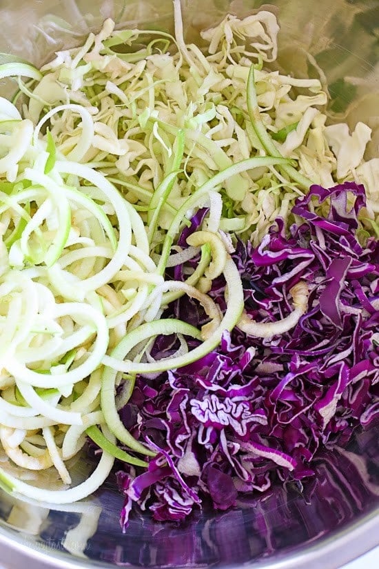 This slaw is super refreshing and takes less than 20 minutes to make. More easy side dishes using my vegetable spiralizer that I love are Raw Spiralized Beet and Mandarin Salad with Mint, Spiralized Veggie Gratin, and Spiralized Carrot Salad with lemon dijon dressing.