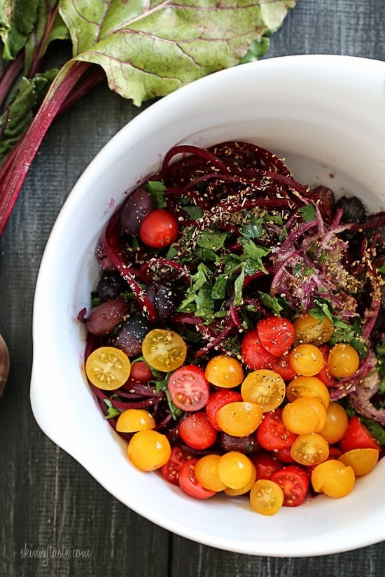 Beet noodles baked with tomatoes, red onion, olives and Feta. Serve this as an appetizer with some baked pita chips, as a side dish or even as a main dish, topped with grilled shrimp or chicken – this dish is a keeper!