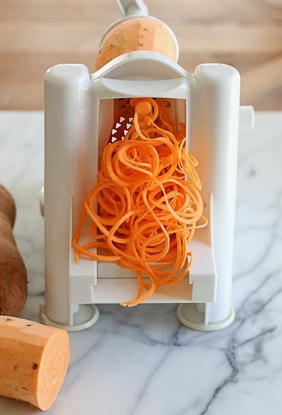 - Cut the sweet potato in half so it fits easily into the spiralizer.