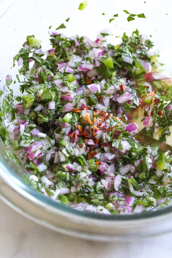 - 6 tablespoons finely chopped red onion