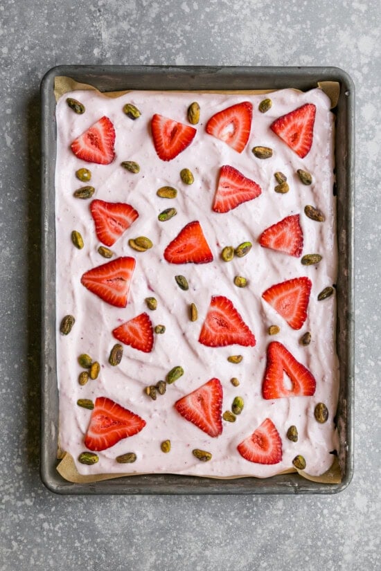 - Add Toppings: Spread the yogurt onto a baking sheet and spread it out evenly. Top with strawberries and pistachios.