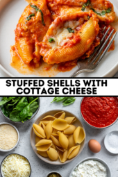 If you’re searching for a comforting yet nutritious dinner that checks all the boxes—high in protein, meat-free, and absolutely delicious—look no further than jumbo Cottage Cheese Stuffed Shells. This recipe is a perfect twist on the classic ricotta-filled pasta dish, swapping in creamy cottage cheese for a high-protein, lighter option that still delivers on flavor. I even snuck in some spinach, which works so well. If you want a high-protein lasagna, try my cottage cheese lasagna rolls or my high-protein meat lasagna recipe. They’re so good!