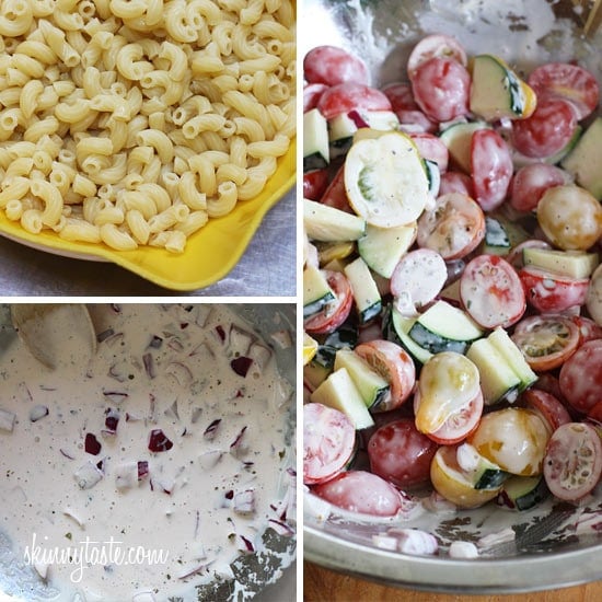 Need a macaroni salad to bring to your next BBQ loaded with summer vegetables? Look no further! When I’m not making this macaroni salad, I’m usually making this zucchini version. It’s the perfect summer pasta salad loaded with fresh summer tomatoes and zucchini tossed in a light creamy dressing. I even snuck in some Greek yogurt for added creaminess but with all the other flavors you won’t know it’s there.