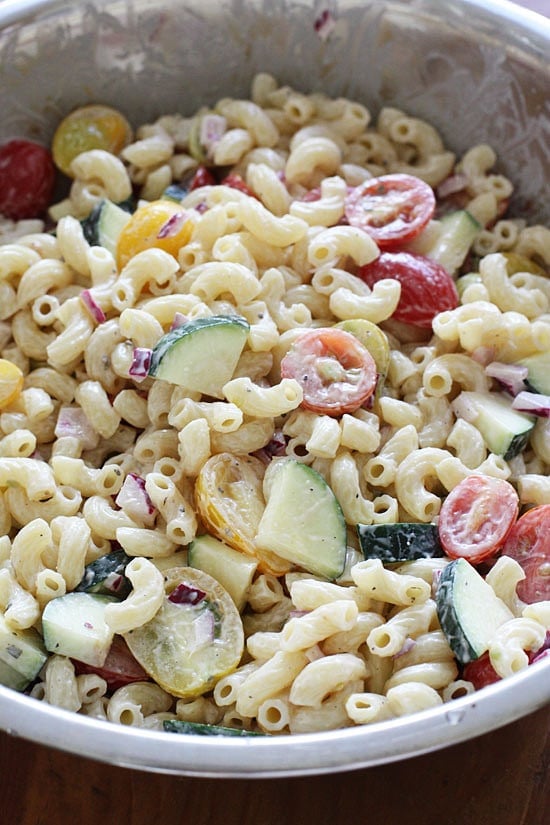 Macaroni Salad with Tomatoes and Zucchini is the perfect summer pasta salad loaded with fresh vegetables tossed in a light creamy dressing.