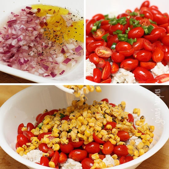 - In a small bowl combine red onion, lime juice, olive oil, pinch of salt and pepper.