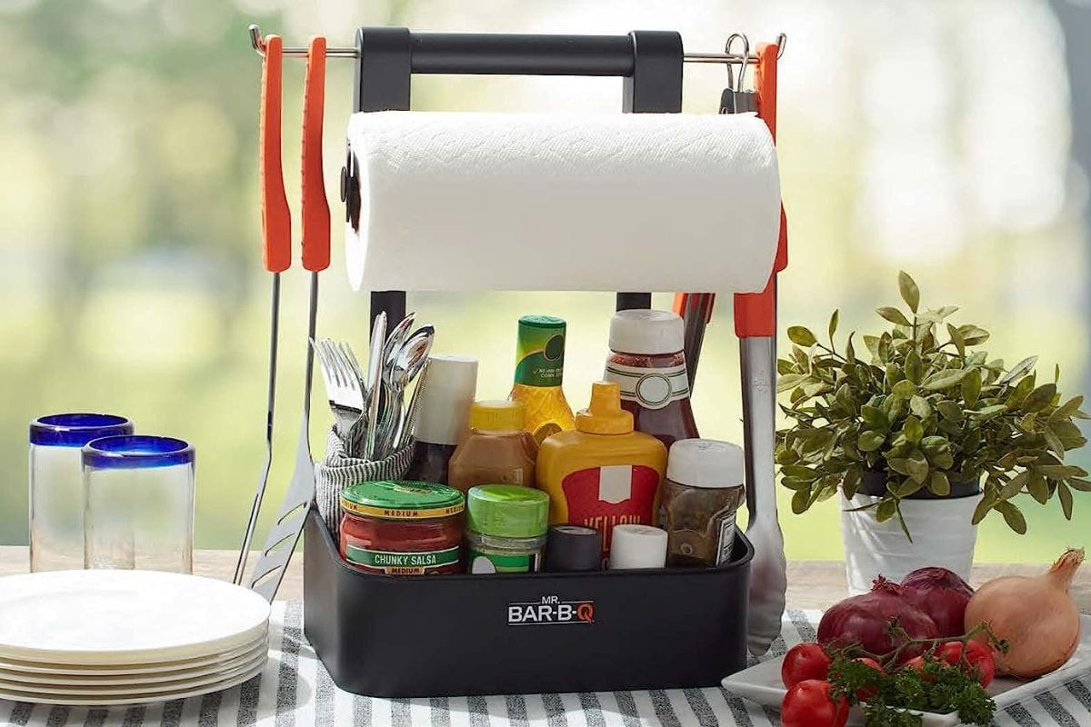 This caddy can fit it all — it has a generously sized compartment for salt, pepper, and your favorite condiments, as well as a built-in paper towel holder. The height can be adjusted so you can hang your grill tools off the side, and there’s a handle on top for easy carrying to your grilling station.Â