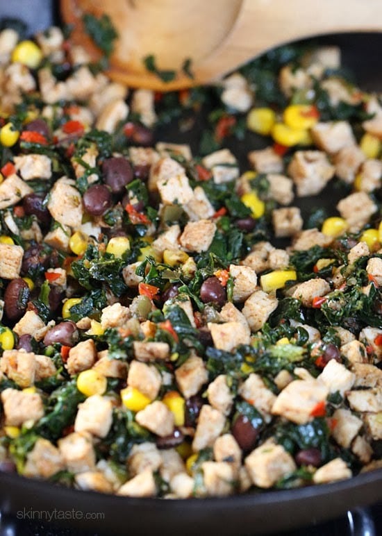 - Add the diced turkey, corn, black beans, spinach, jalapeno peppers, cumin, chili powder, salt, and cayenne pepper to the pan. Cook for another 3 to 4 minutes, stirring well so the spinach gets mixed in with everything.