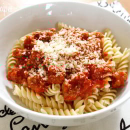 Serving: 1 cup pasta, 1/2 cup sauce, Calories: 297 kcal, Carbohydrates: 48 g, Protein: 17 g, Fat: 6 g, Saturated Fat: 1 g, Cholesterol: 31 mg, Sodium: 560 mg, Fiber: 5 g, Sugar: 4 g