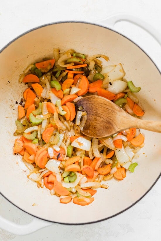 - Cook the veggies: Sauté the carrots, celery, and onion over medium-low heat until they are softened. Then, add the garlic and herbs.