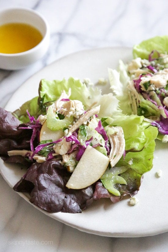 A lighter take on the classic Waldorf Chicken Salad served in lettuce leaves so you can eat them with your hands instead of a fork!