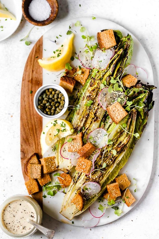 For a fun twist on a Caesar salad, it’s made with grilled Romaine, like I did with this Grilled Romaine, Corn and Chicken Salad, the texture of grilled lettuce is wonderful, but you can also skip that step if you prefer.